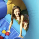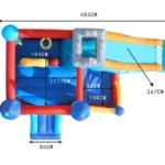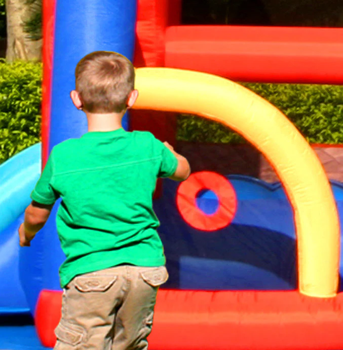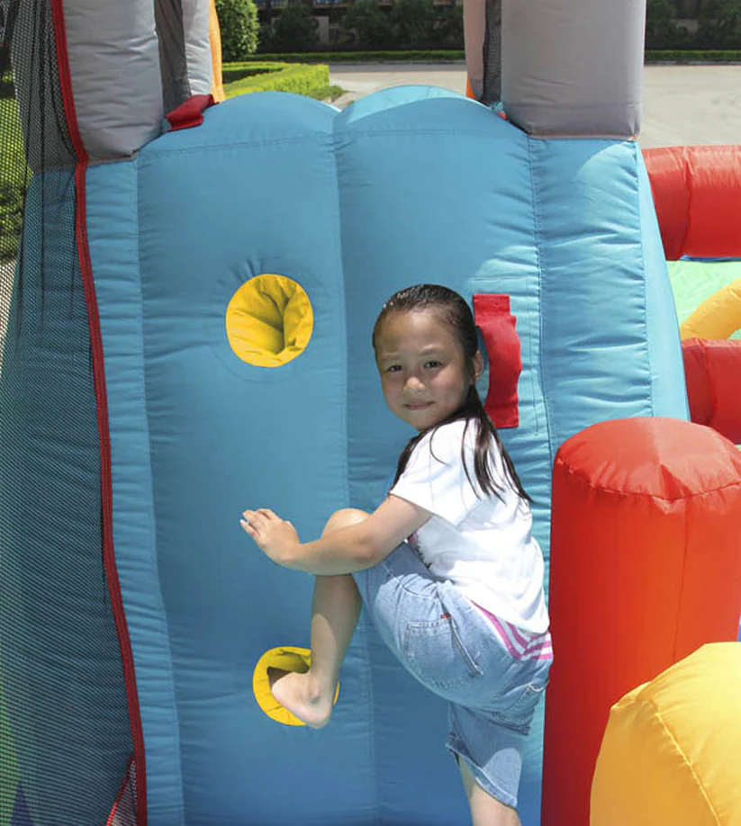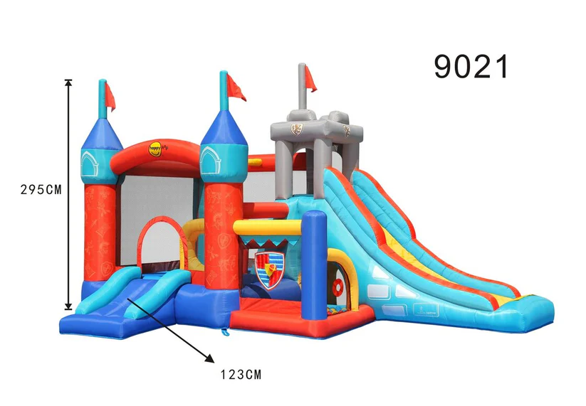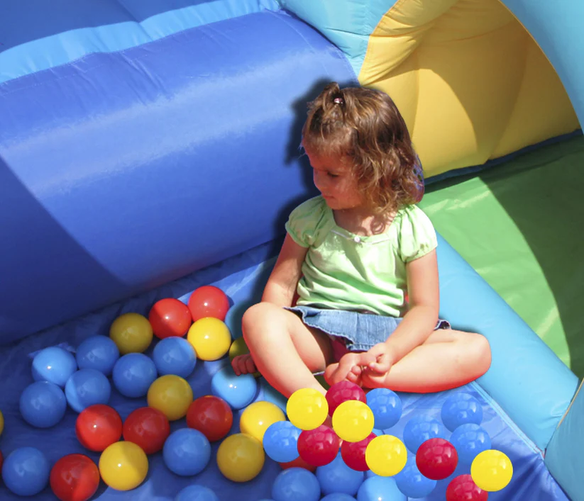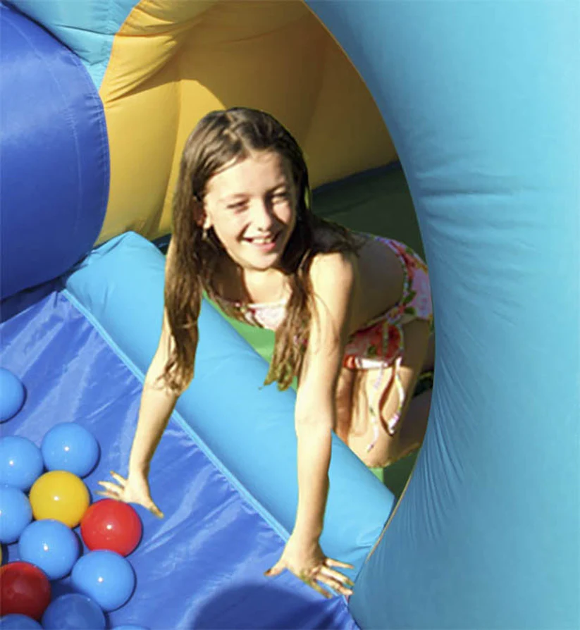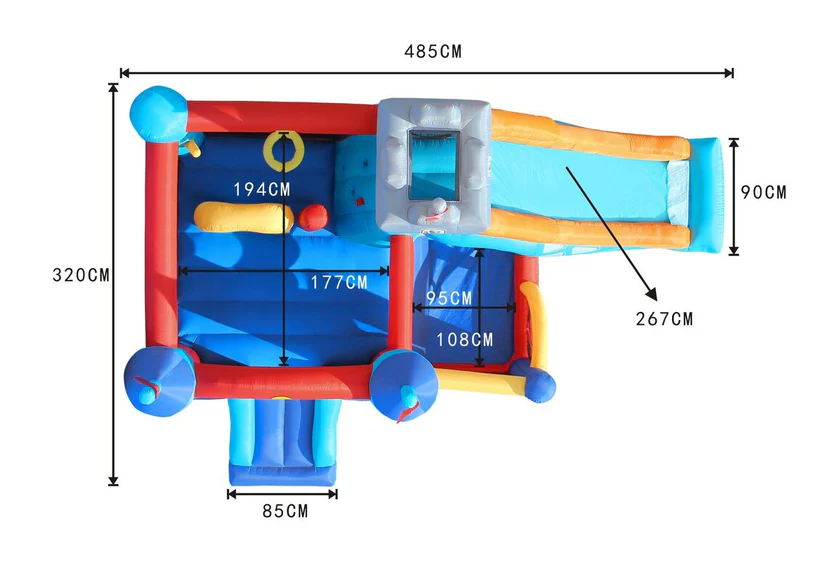 - Csomag tartalma: légvár + befúvó motor + szállító táska + rögzítő cövekek + javító készlet + 30 db kislabda